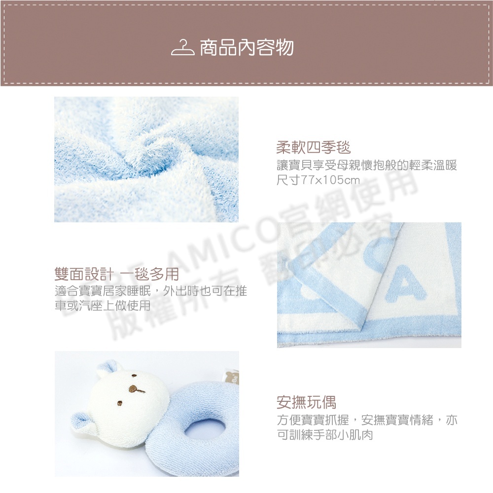 材質:毯子-聚酯纖維100% 玩偶-棉100%(表)、聚酯纖維100%(填充物)
